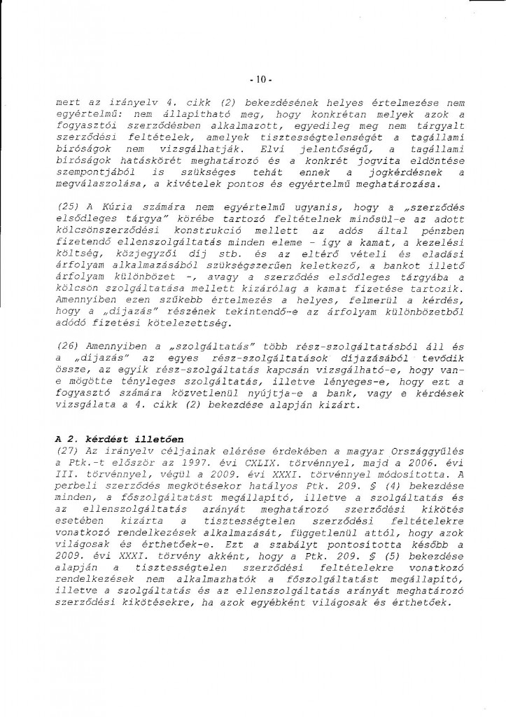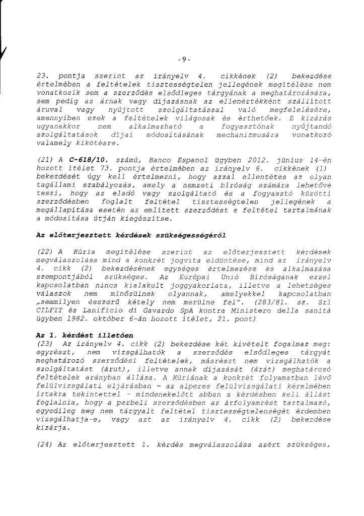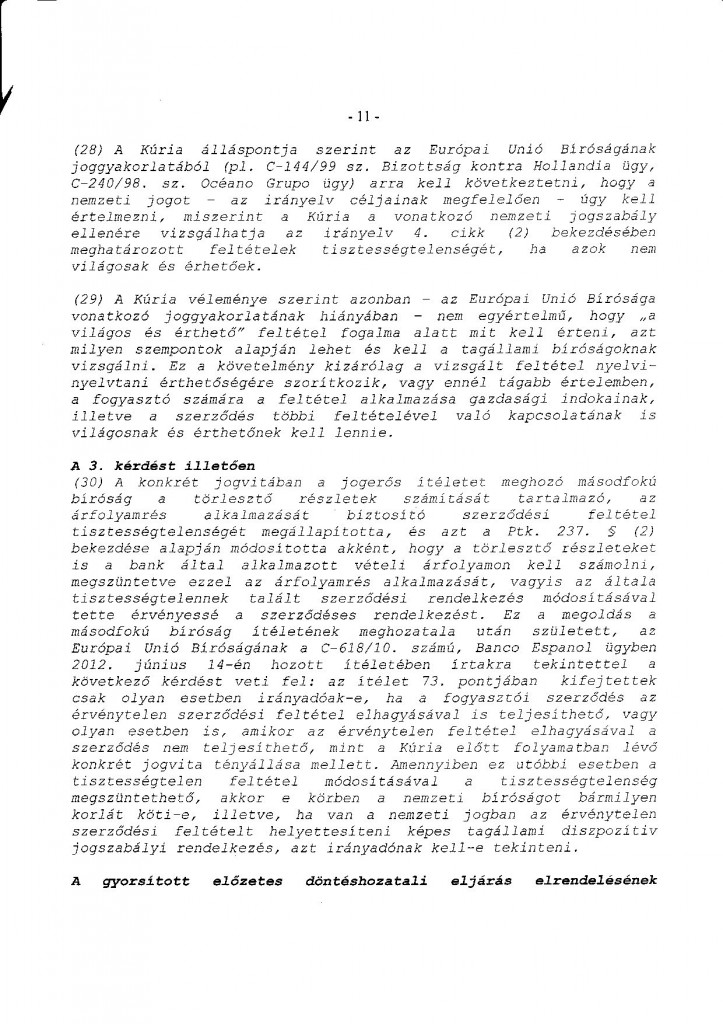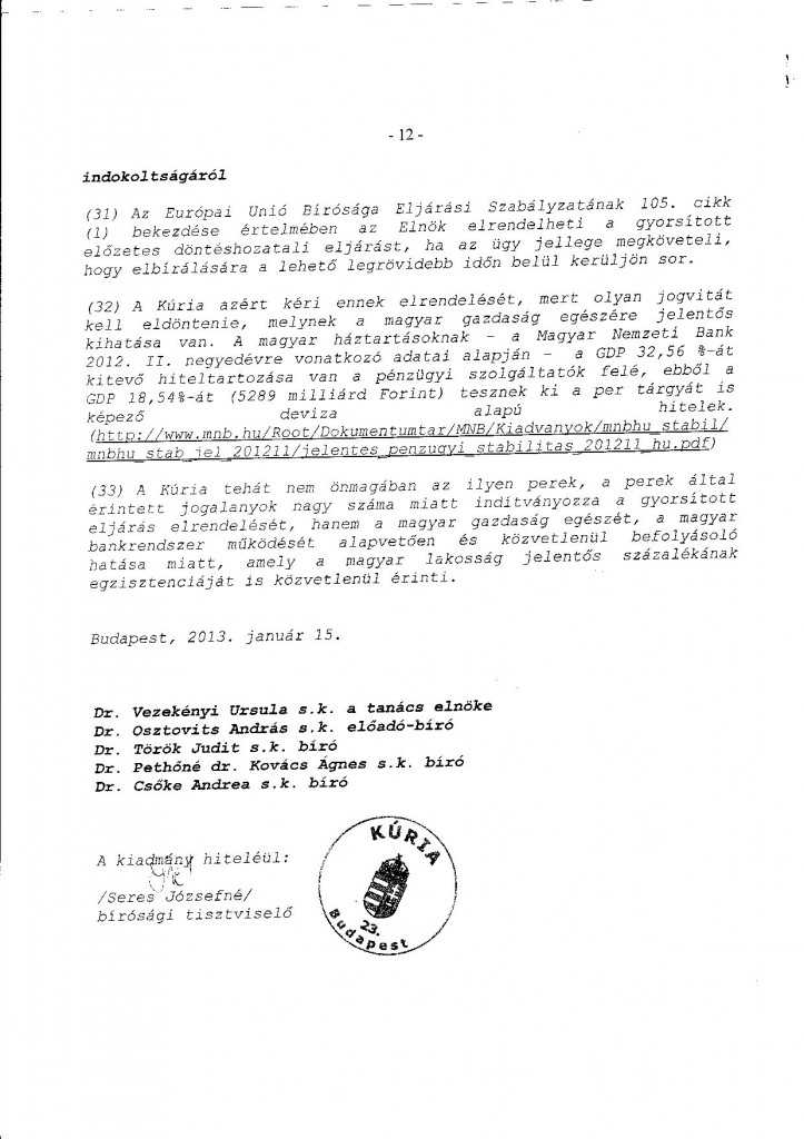 »(33) A Kúria tehát nem önmagában az ilyen perek, a perek által érintett jogalanyok nagy száma miatt indítványozza a gyorsított eljárás elrendelését, hanem a magyar gazdaság egészét, a magyar bankrendszer működését alapvetően és közvetlenül befolyásoló hatása miatt, amely a magyar lakosság jelentős százalékának egzisztenciáját is közvetlenül érinti.«