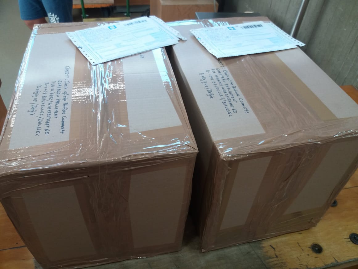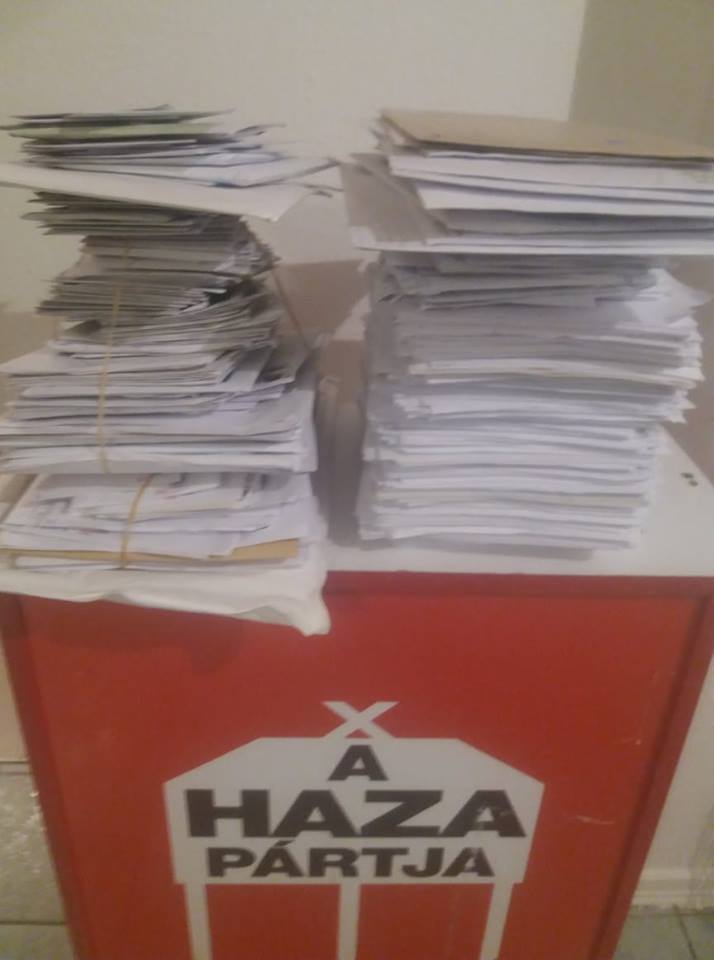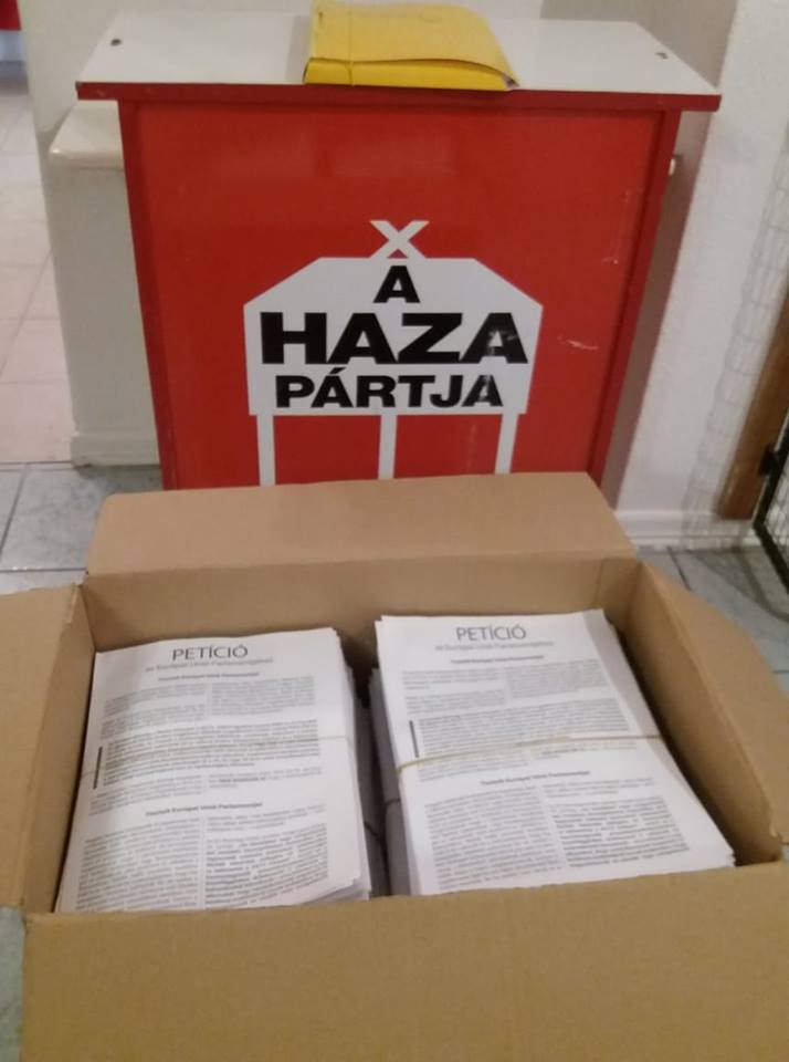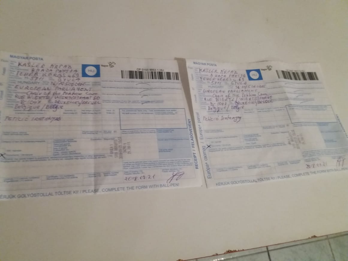 Nekem így is jó. 16 órakor útnak indítottam 48 kg petíciót. A feladási ára 59 850 forint volt. Csak érdekességként mondom, hogyha mindenki egyenként ajánlottan küldte volna ki Brüsszelbe, a tízezer petíció feladása 15 millió forintba került volna.